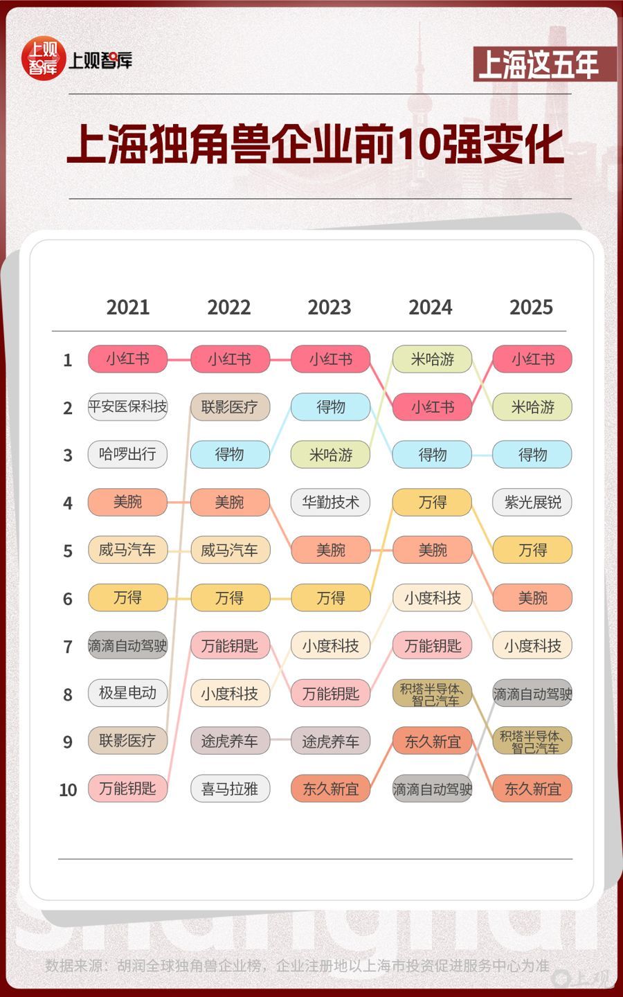 前10位的上海独角兽企业,从2021年到2025年,发生了不小的改变。有的企业已经上市,如联影医疗、华勤技术等;有的企业悄然退场;有的企业仍持续霸榜,如小红书、米哈游、得物、美腕、万得。独角兽企业的变动与产业趋势息息相关。当新能源汽车产业进入高质量发展的阶段时,智己汽车接过领军大旗;在AI芯片成为市场热点时,积塔半导体、紫光展锐已跻身芯片新势力代表之列。