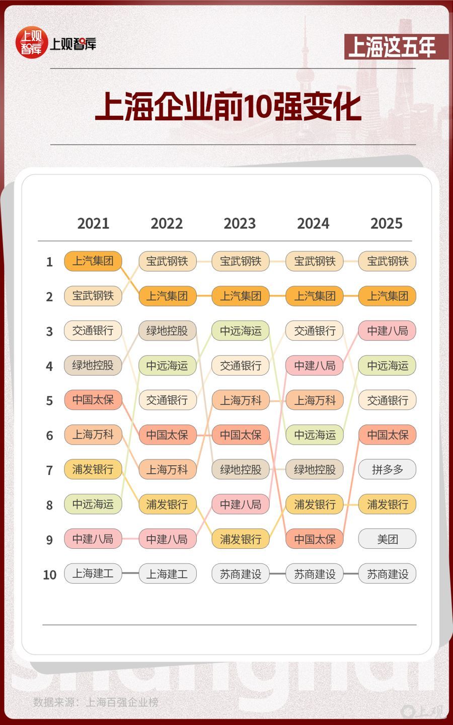 这份由上海市企业联合会、上海市企业家协会、上海市经济团体联合会和解放日报社共同发布的榜单,从2021年到2025年,见证了传统企业的转型与创新企业的涌现。在前10强的名单中,制造业仍然是上海产业的压舱石,而房地产、建筑企业从2021年占比达40%,到2025年占比降低为20%。互联网企业在2025年冲上前10强,并占据了20%的席位,亮出了上海经济多元发展的成绩单。