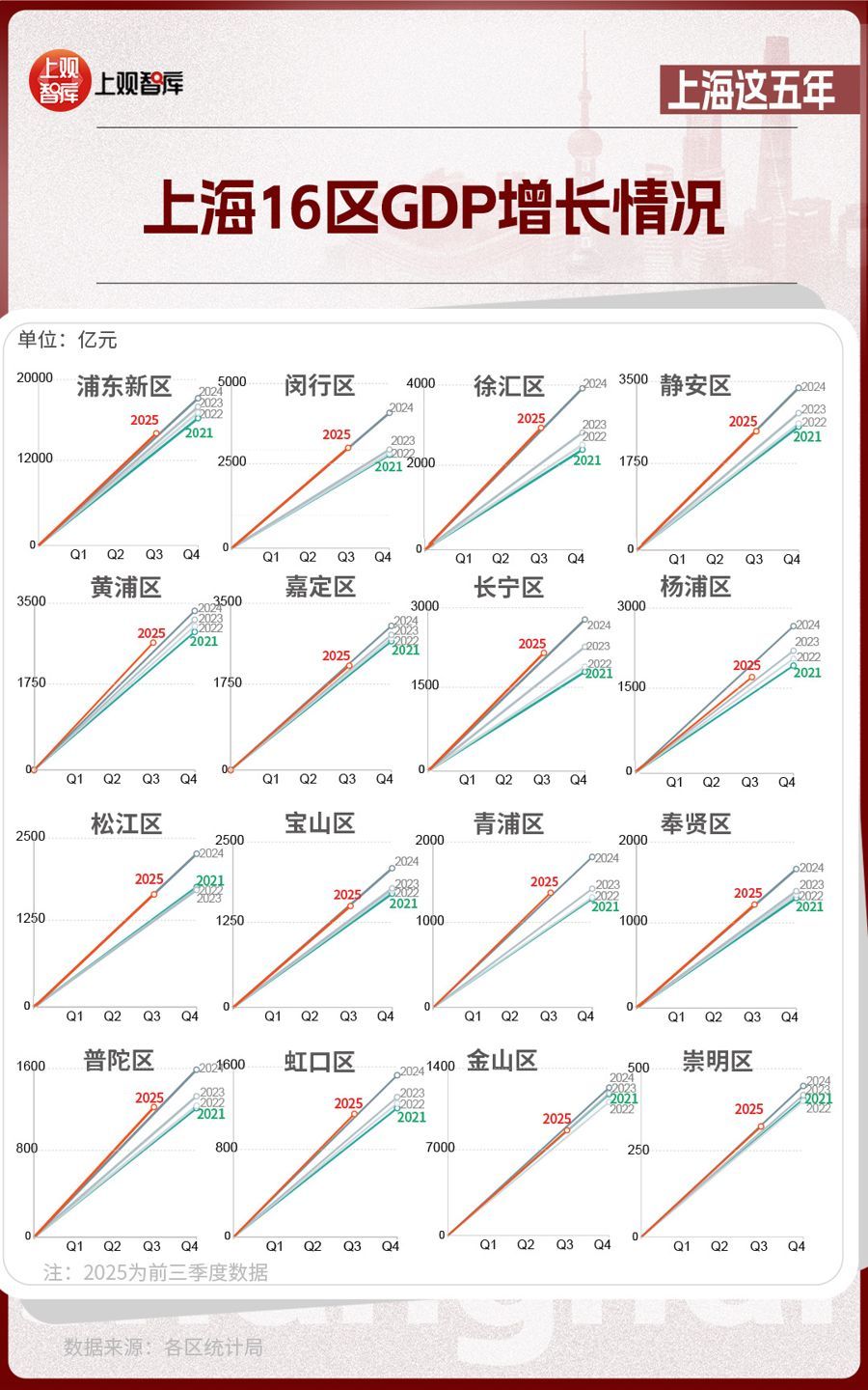 区域层面,上海16区GDP的变化,体现出从中心向多极扩散的趋势。2021年,浦东新区GDP占全市近36%,而到了2025年,这一比重下降至约33%。其他区在这五年间,充分发挥自身优势,齐头并进,为上海发展创造了更多增长极。