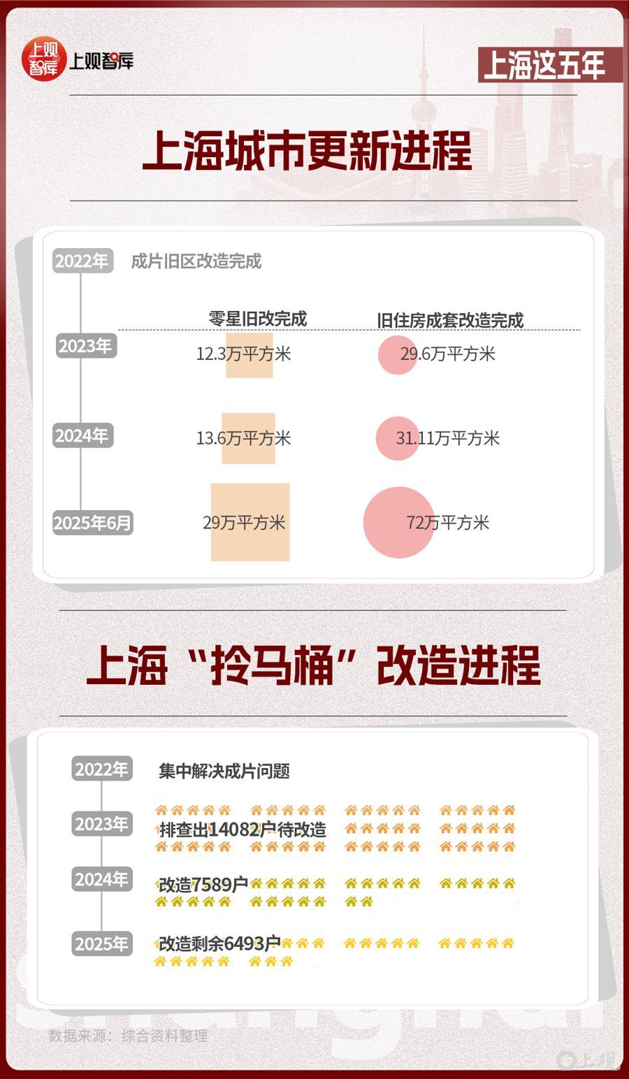 2022年,上海市成片旧区改造完成;此后,上海加力推进“两旧一村”改造。2023年到2025年6月底,零星旧改完成约29万平方米,旧住房成套改造完成约72万平方米,城中村改造认定44个项目,完成老旧小区改造3910万平方米,提前完成旧改核心任务。