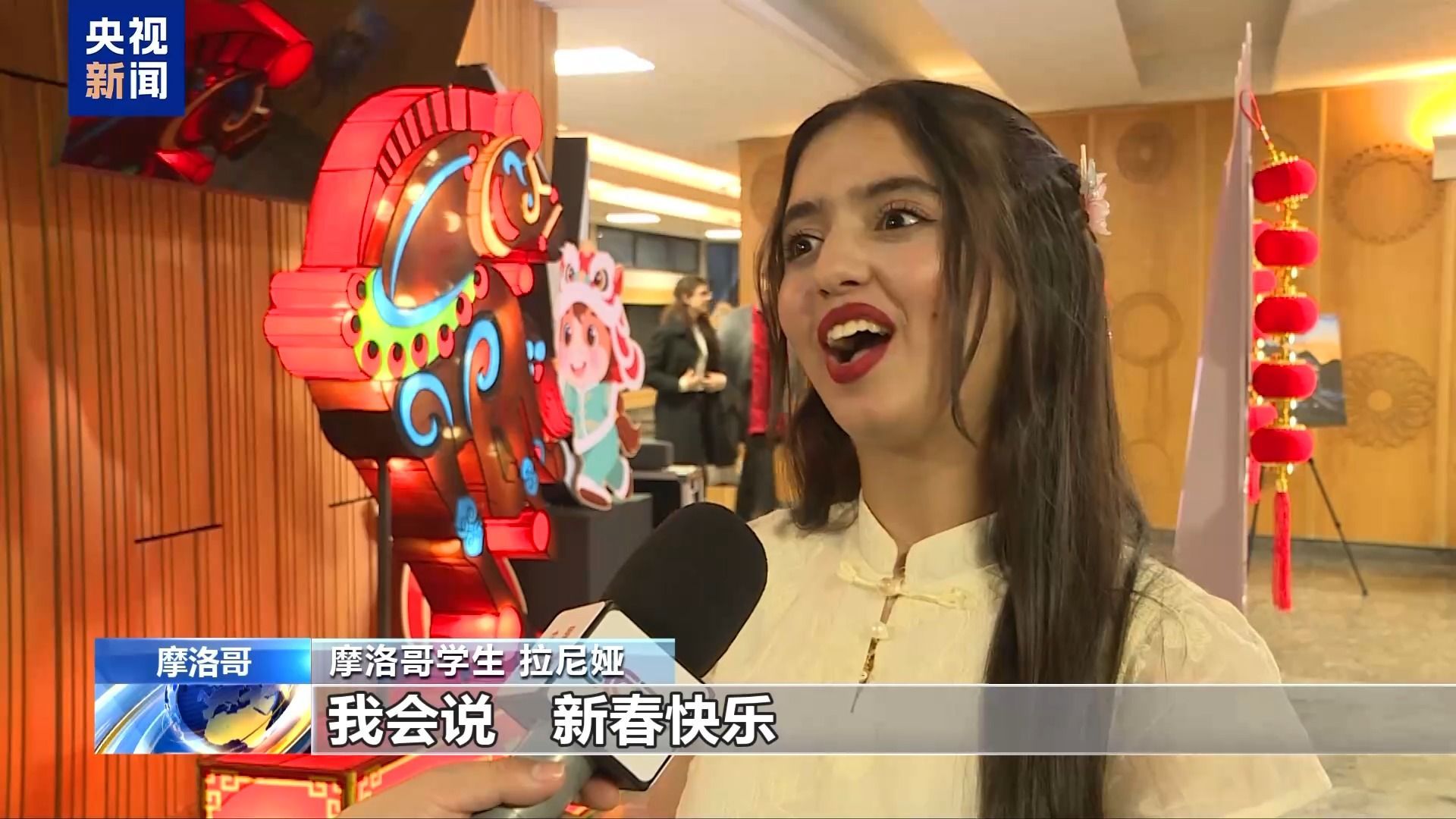 摩洛哥学生 拉尼娅:今天我很高兴,我知道(中国春节)要吃饺子,发红包,有些红包金额会包含数字8,因为寓意吉祥。我会说,新春快乐。
