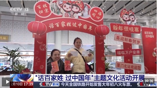 福建厦门车站厦门北站客运值班站长 丁岑:春运期间也是台胞、侨胞出行的高峰期,我们希望通过这次活动让广大旅客以及台胞、侨胞了解中华文化及姓氏文化,让大家在返乡的路上感受到浓浓的年味。