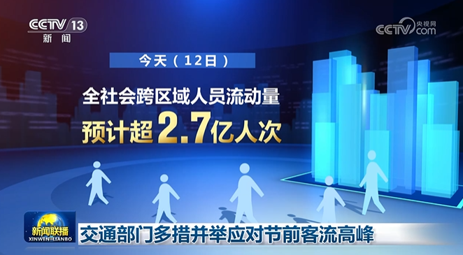 央视网消息(新闻联播):记者从交通运输部获悉,2月12日,全社会跨区域人员流动量预计超2.7亿人次,比2025年同期增长3.4%。