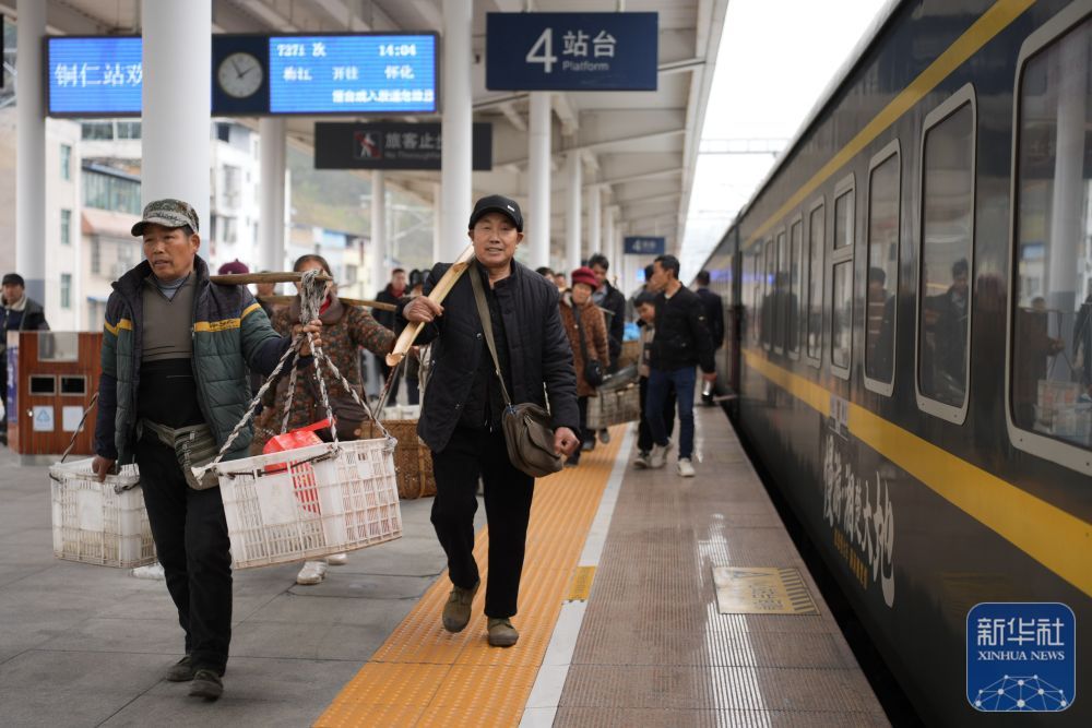 ↑ 2月12日,村民挑着新鲜果蔬准备搭乘7272次公益性“慢火车”前往贵州铜仁。新华社记者 刘续 摄