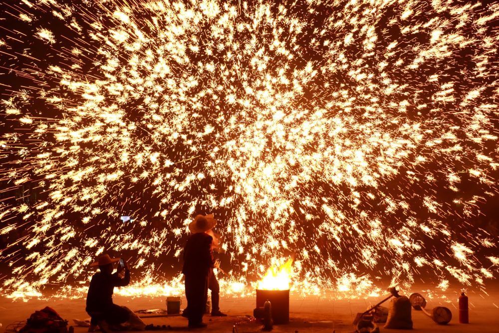 ↑ 2月14日,在河南省安阳市内黄县文化体育中心,民间艺人表演打铁花。新华社发(刘肖坤摄)
