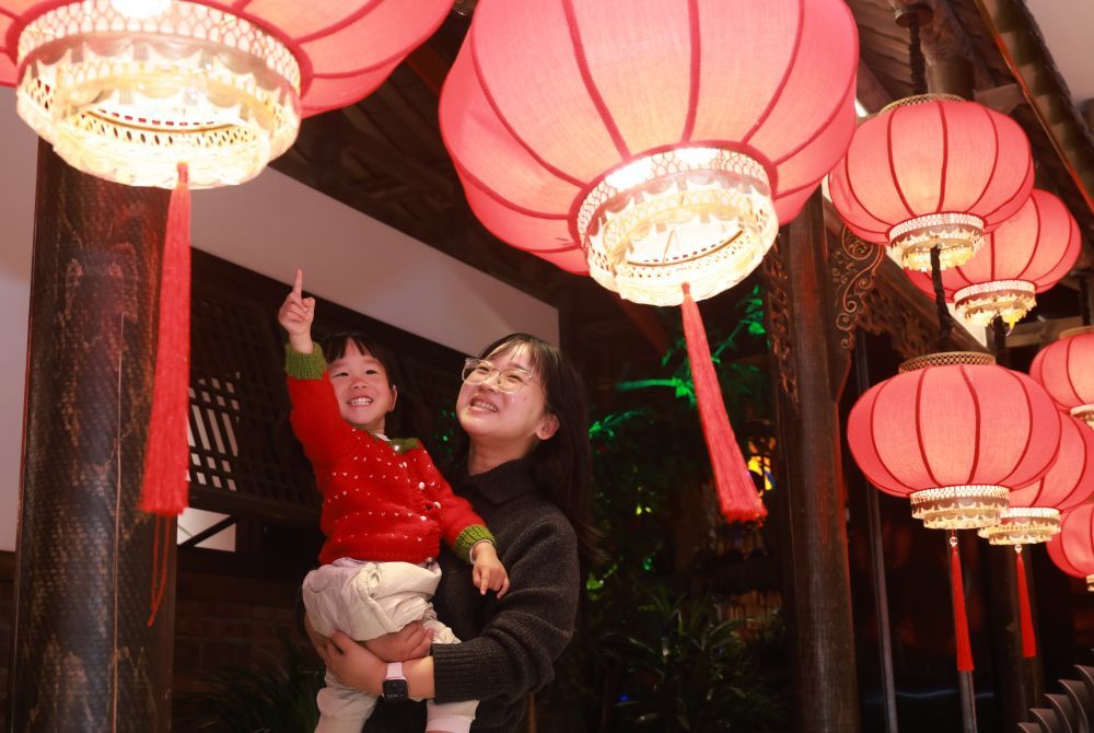 ↑ 2月14日,人们在湖北省武汉市武昌区一家购物中心红灯笼下玩耍。新华社发(赵军 摄)