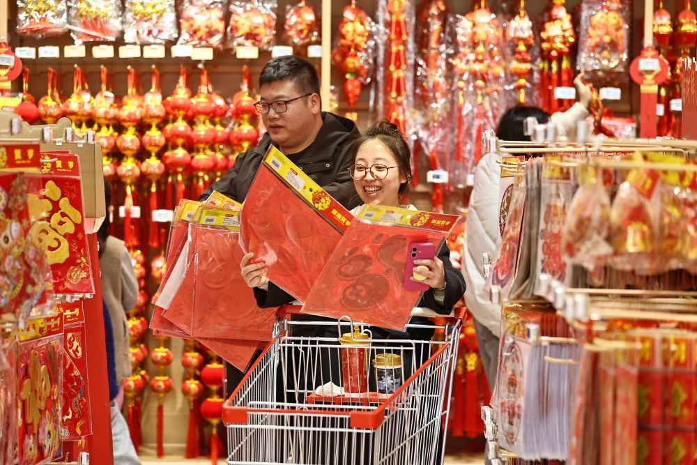↑ 2月14日,在浙江省嘉兴市南湖区一家大型商场“年货一条街”,市民在选购福字。新华社发(金鹏 摄)