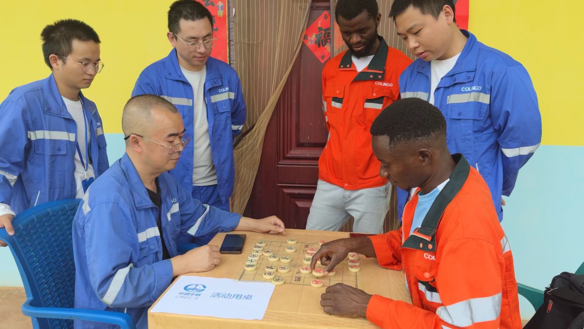 锣鼓声擂响,喜庆的氛围瞬间蔓延开来。象棋桌前,围满了好奇的当地员工。