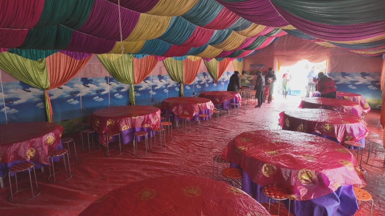 大家一起动手,不到半小时,一个大约一百平方米的移动帐篷宴会厅平地而起,配套的桌椅、桌布、取暖设备和照明电灯等一样不少。锅灶、煤气炉、蒸箱一字排开,就在帐篷门口,真正“明厨亮灶”。备好了大件,大家开始洗青菜、择菜,这些当天现弄才新鲜。