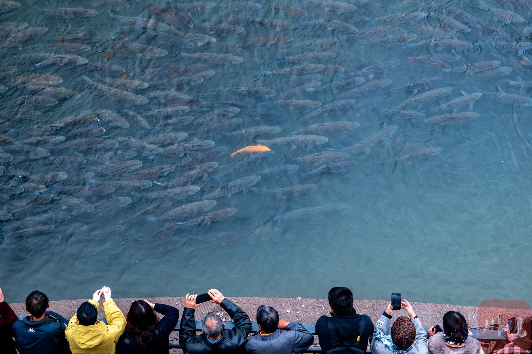 2025年11月11日,宜宾合江门金沙江与岷江交汇处,野生鱼群正追逐着游客抛撒的鱼食。川观新闻记者 何海洋 摄