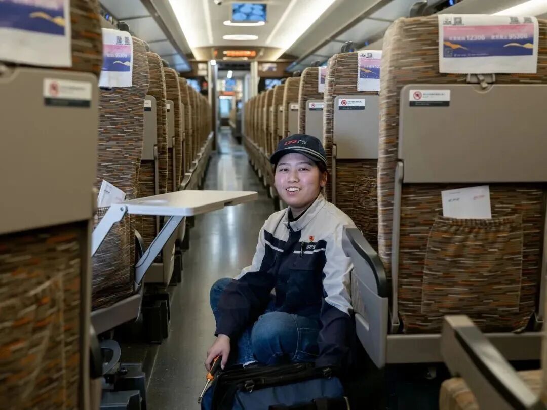 邓海韬,“车厢管家”,负责检查座椅、行李架、遮阳帘、卫生间等设施。