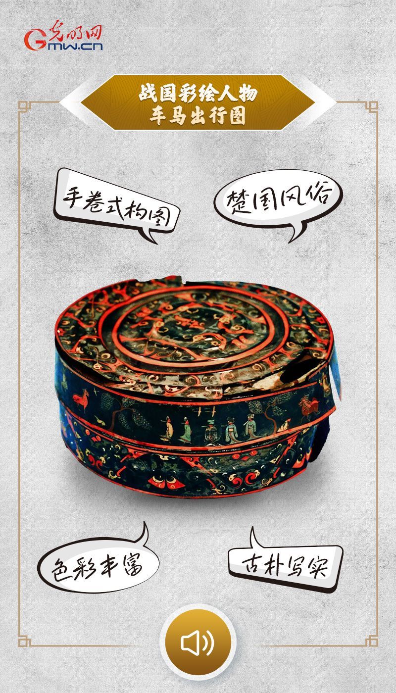 战国彩绘人物车马出行图现藏于陕西历史博物馆,出土于湖北荆门包山楚墓,是一件漆奁外壁一周的漆画,展开全长87.4厘米,宽5.2厘米,描绘了战国时期人物车马出行的场景。画中用土黄、桔红、海蓝和棕色等颜色,勾勒出一幅色彩艳丽、生动活泼、富有立体感的图画。