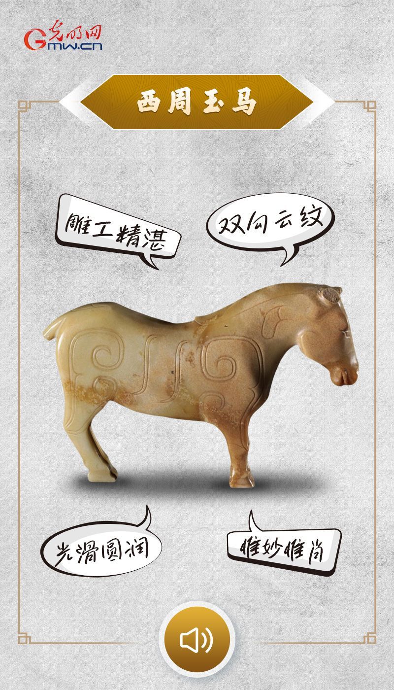 西周玉马现藏于山西博物院,高5厘米,宽7.7厘米。出于晋侯墓地63号墓。灰白色圆雕。马颈项粗壮,鼻翼翕张,胸肌略鼓,臀腹紧圆,颇符解剖原理。婉转柔和的双勾阴线云纹表现马的肌理轮廓,兼具写实与装饰之美。