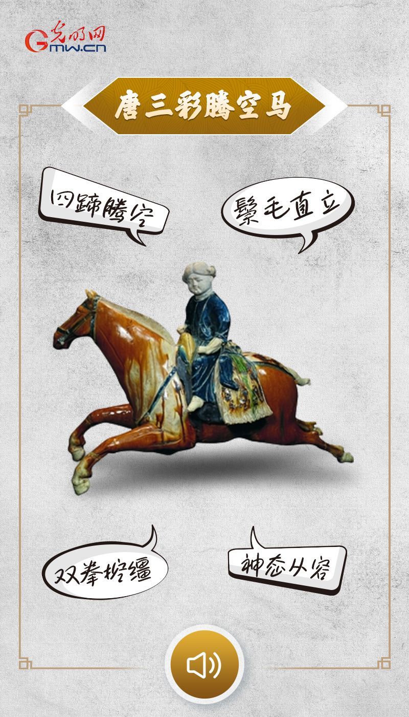 唐三彩腾空马现藏于西安博物院,通高38厘米,长52厘米,由骑手和飞奔的悍马两部分组成。骑手为胡人少年,端坐在马背上,头发中分,两耳旁各梳有一个发髻,面部丰腴,笑容满面,双拳紧握于腰间牢牢控制马的“缰绳”,骑手身穿蓝色长袍,腰间系有革带,革带上挎了一个袋囊,脚上蹬尖头靴子。马的体型彪悍,作腾空跃起式,颈上鬃毛直立,马鞍上有白、绿、黄三色相同的袋囊。这件腾空马以生动、逼真的造型,鲜美的釉色,成为唐三彩中题材仅见的精品。虽是一个静止的动作,却表现出了骏马疾驰,骑马者不慌不忙的姿态,足以展示制作者的高超技艺。