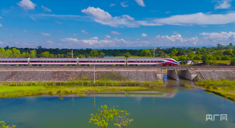 中老铁路D87次国际旅客列车奔驰在老挝万象(央广网发 杨永全 摄)