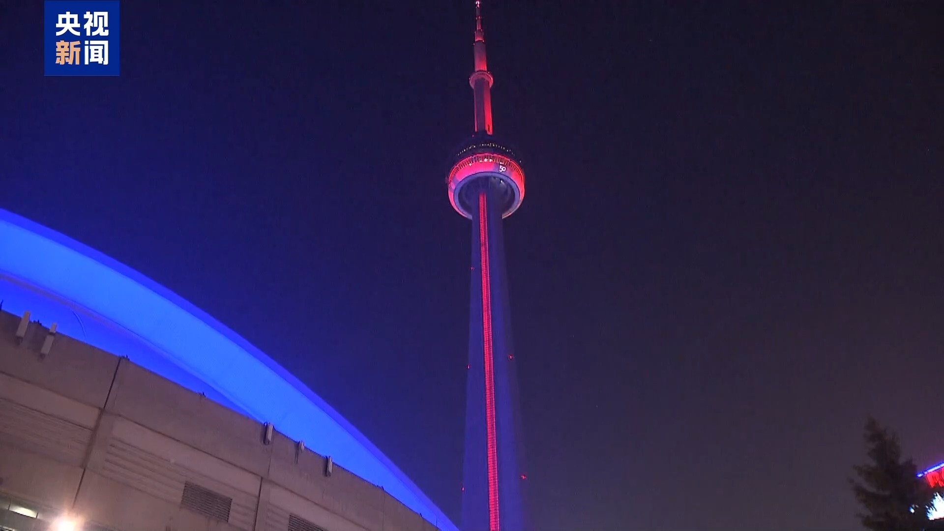 当地时间17日(农历大年初一),加拿大最大城市多伦多的地标建筑国家电视塔点亮红色灯光,迎接农历马年春节的到来。