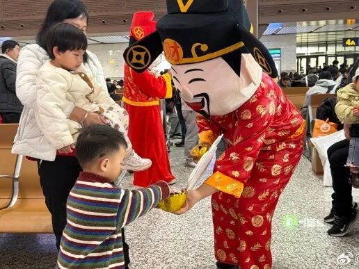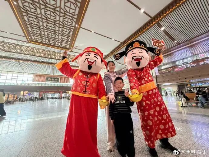 2月21日正月初五,民间有“迎财神”的传统习俗,西安站携手白鹿原影视城开展“迎财神送福”活动。两位身着红袍、笑容可掬的“财神爷”惊喜现身候车室,为广大旅客送上新春的美好祝福与吉祥好运。(文字:苏楷淇)