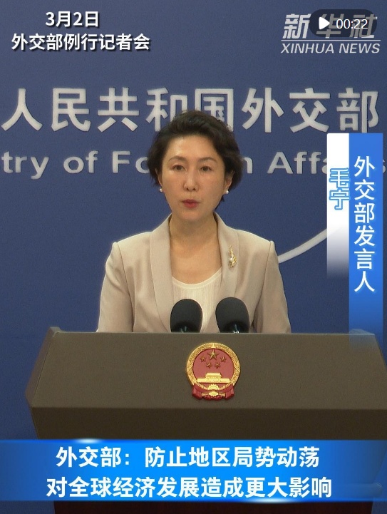 【简介】外交部发言人毛宁3月2日在例行记者会上就美以军事打击伊朗答问时表示,霍尔木兹海峡及其附近水域是重要的国际货物和能源贸易通道,维护这一地区安全稳定符合国际社会共同利益。中方敦促各方立即停止军事行动,避免紧张事态进一步升级,防止地区局势动荡对全球经济发展造成更大的影响。