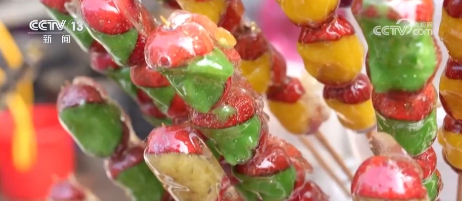 临近元宵节,在河北沧州任丘市吕公堡镇的“糖墩庙会”上,摩肩接踵、人头攒动,摊位一个接一个挤满整条街。除了传统的山楂、山药口味,在这里,西红柿、葡萄、草莓、柚子,甚至柿子椒、辣条也被裹上了亮晶晶的糖外衣。这些新奇的口味,吸引不少游客买来尝鲜。