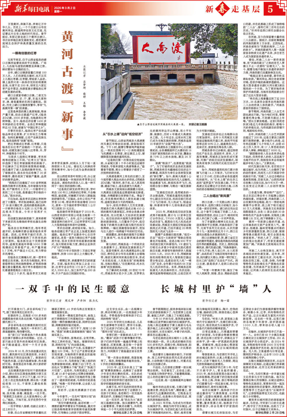 万里黄河,奔腾不息,养育亿万中华儿女。历史上,一个个古渡口分布在黄河岸边,联通两岸经贸文化交流,见证着这片古老土地的时代变迁。春节前后,本报记者走进三个黄河古渡口,寻访沿岸地区新发展新变化,感受黄河流域生态保护和高质量发展的生机活力。