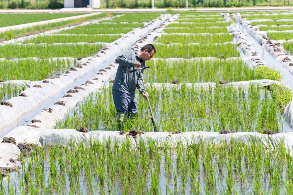 2025年6月18日,在位于黑龙江省双鸭山市宝清县的中国水稻研究所北方水稻研究中心的试验田内,科研人员取耕层土样。新华社记者 谢剑飞 摄