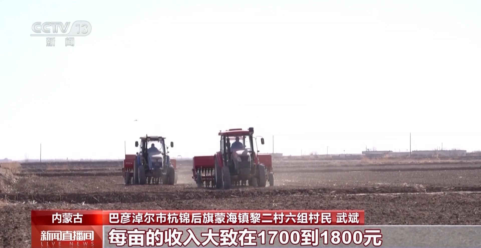 巴彦淖尔市杭锦后旗蒙海镇黎二村六组村民 武斌:种的6000多亩地,其中1000多亩种小麦,享受国家的补贴大致是500元每亩,麦后复种燕麦草,每亩的收入大致在1700到1800元。