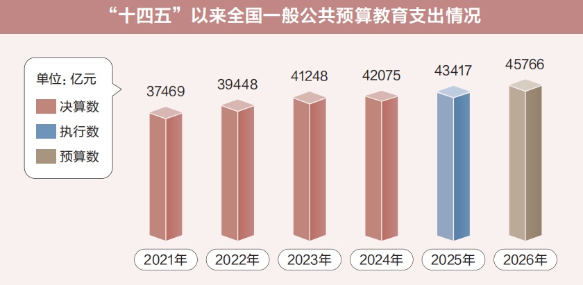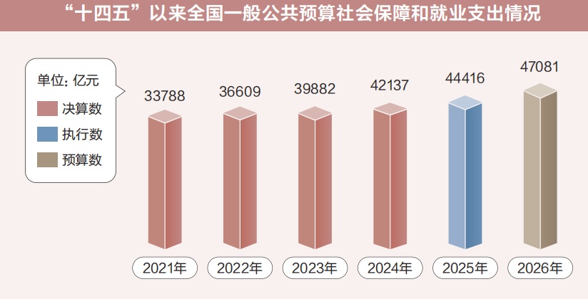 2026年,全国一般公共预算教育支出安排4.58万亿元、增长5.4%;全国一般公共预算卫生健康支出安排2.26万亿元、增长5.2%;全国一般公共预算社会保障和就业支出安排4.71万亿元、增长6.0%,城乡居民基础养老金月最低标准再提高20元……一组组数据彰显民生领域财政持续投入力度。