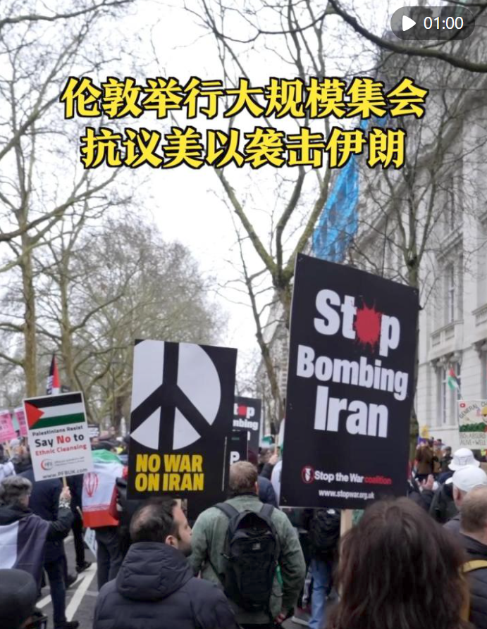 3月7日,美国、英国、加拿大、南非等多国民众举行游行集会,抗议美国和以色列对伊朗发动军事打击,要求美以政府停止针对伊朗的战争行为。
