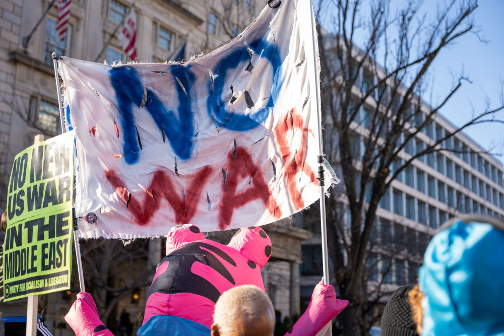 3月7日,人们在美国华盛顿参加集会,抗议美国和以色列对伊朗发动军事打击。