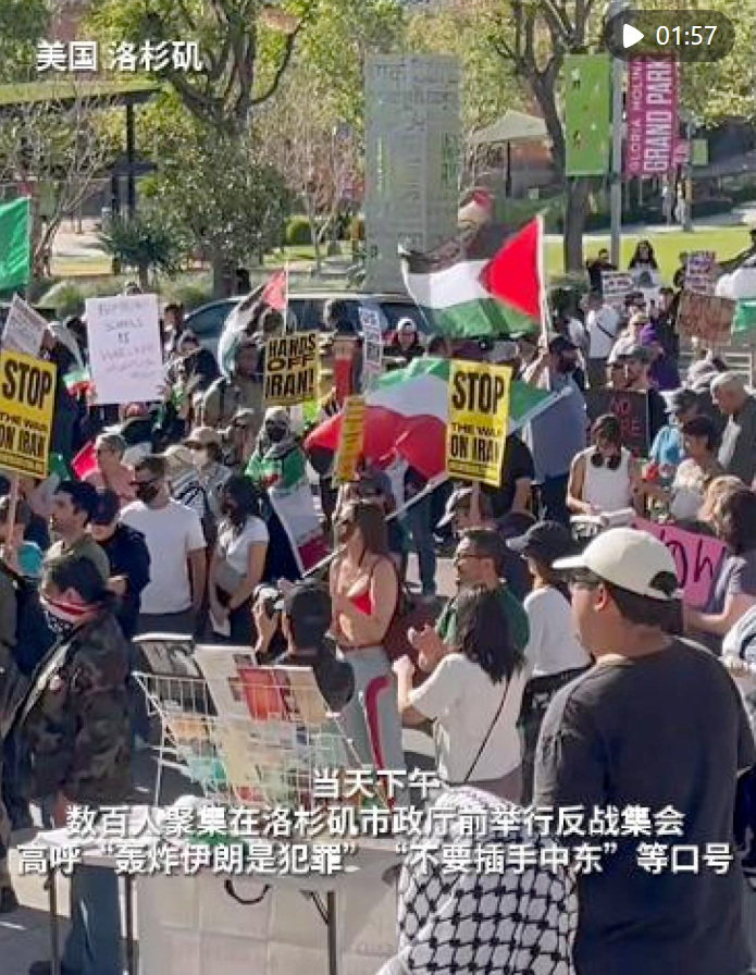 当天,数百名民众聚集在纽约市曼哈顿联合广场,高举伊朗国旗,手持“停止对伊朗战争”“不要插手伊朗”等标语,高呼“当今世界最大的威胁是特朗普和美国”。