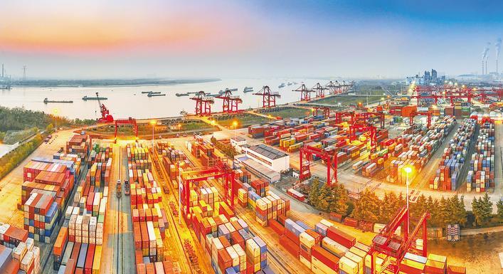 夜幕下的武汉阳逻港集装箱码头,货物装卸繁忙有序。(湖北日报全媒记者 薛婷 摄)