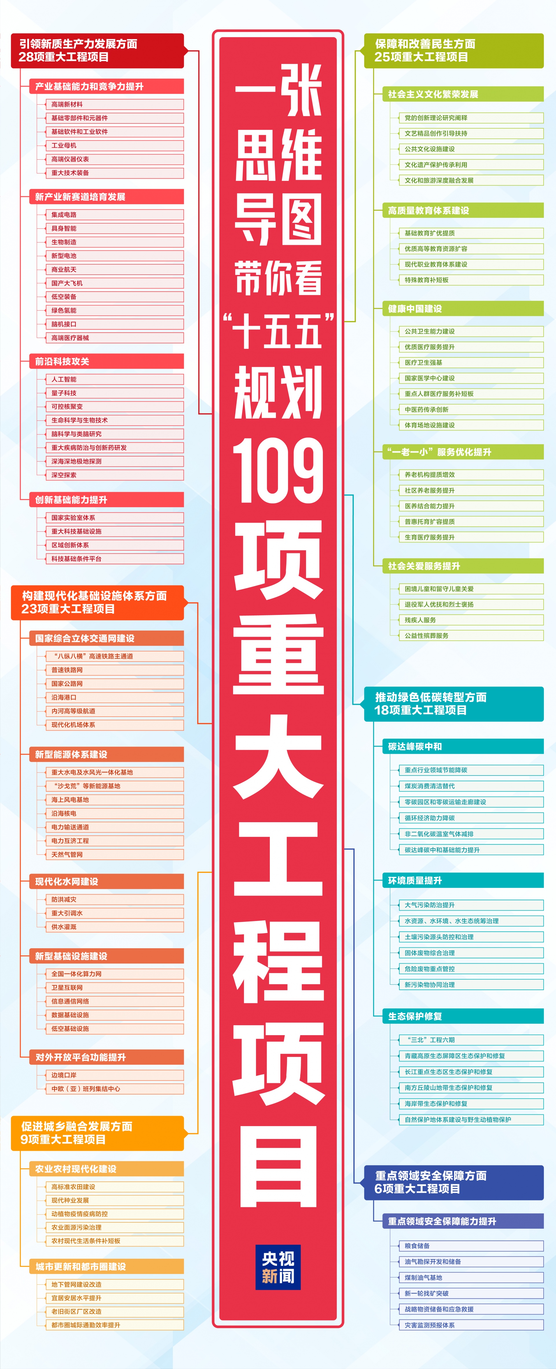 同时,规划纲要还提出6个方面109项重大工程。从这张重大工程项目思维导图中,大家可以直观感受到“十五五”规划纲要的系统与精细。