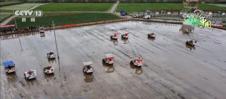 在广东高州市石鼓镇,多台高速插秧机在水田中作业,今年当地选用优质早稻品种,利用密植插秧机缩小行距,每亩秧苗种植量从1.1万株提高到1.6万株,单产增幅预计超15%。