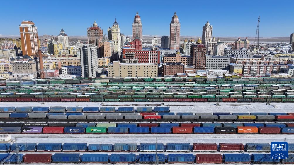 2月26日,中欧班列在中国铁路哈尔滨局集团有限公司满洲里站等待出境发车(无人机照片)。新华社发(黄旭摄)