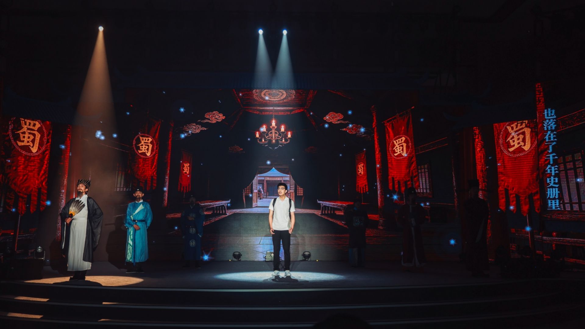 舞台剧尾声,六位先贤并肩而立,汪国伟举起手中的《名录》,面向观众,高喊:“蜀法之光,川流不息。”