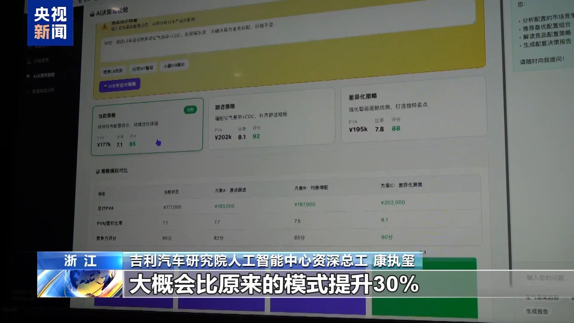 吉利汽车研究院人工智能中心资深总工 康执玺:一辆车上大概有数千个软件模块,它背后可能要有几千个工程师一起协作才能完成这样一个复杂工程的开发。现在我们通过一个AI驱动的软件开发的活动,整体上我们的效率大概会比原来的模式提升30%,写代码这件事情我们甚至可以提升50%的效率。