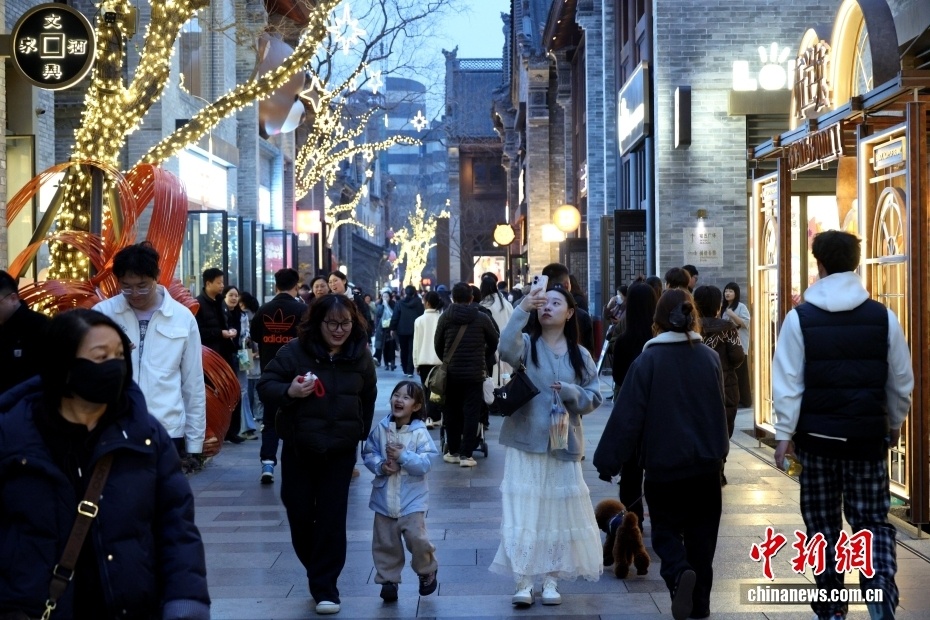 郑州亳都·新象位于商都历史文化区核心区,东临商代都城遗址博物院,西临全国第二古老的文庙——郑州文庙,并与城隍庙、东城垣遗址博物馆等景点深度联动,形成“一街区连多景、古今文商旅一体”的互动模式。这里15个主题院落错落有致,青砖灰瓦间藏着当代匠心,饕餮纹、海云纹、大象形象、“亳”字化作独有文化符号,被誉为郑州版的“新天地”。图为郑州亳都·新象华灯初上,市民休闲购物。