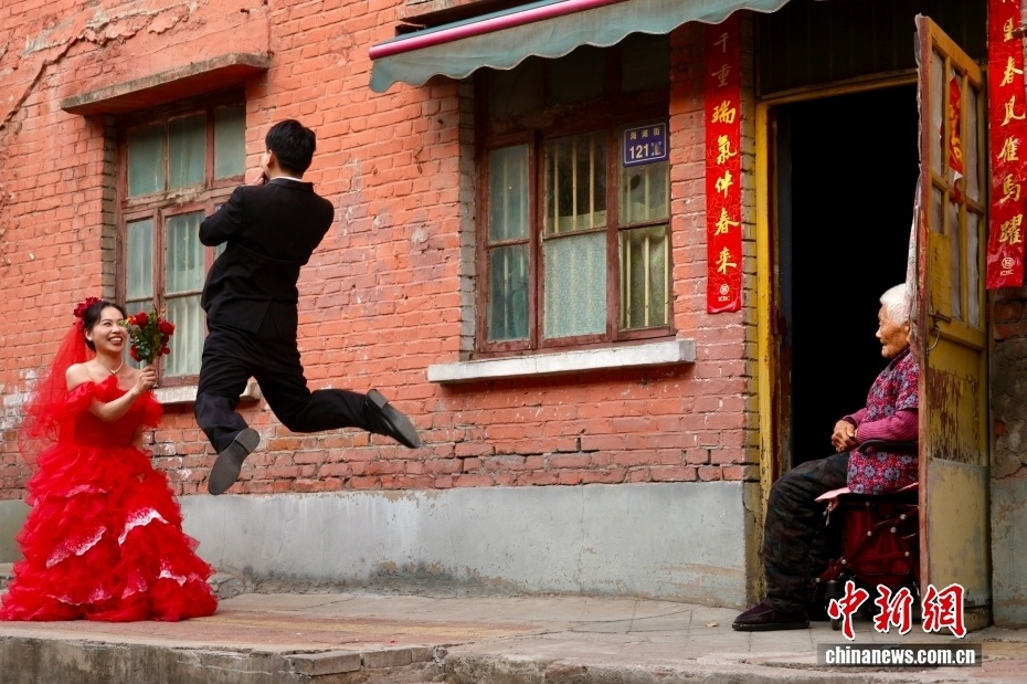 郑州海滩街是金水区一条充满生活气息的老街,通过微改造,沿街老居民楼底层转变为咖啡馆、花店等特色小店。这里红白蓝色彩尽染,临街而坐,点上一杯咖啡,嗦一口米粉,即可感受“遗世而独立”的松弛生活,是城市更新的“小而美”样本。图为一对新人在郑州海滩街蜜柚巷取景拍摄,旁边,一位老人静静坐在居民楼前注视这一幕。新与旧在同一空间交汇,海滩街的烟火气与时光感,在这一刻悄然定格。