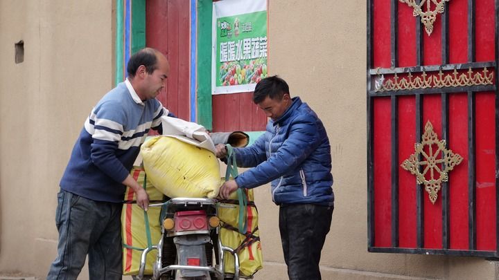 2026年2月8日,来自河南的超市老板魏泽潘(左)在帮顾客固定购买的商品。新华社记者 党黎 摄