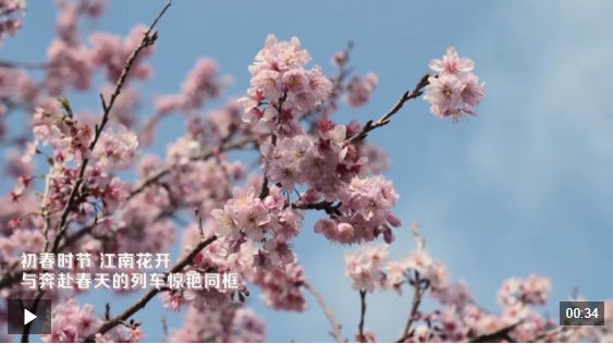 △复兴号驶过合福高铁武夷山北站旁的樱花林。