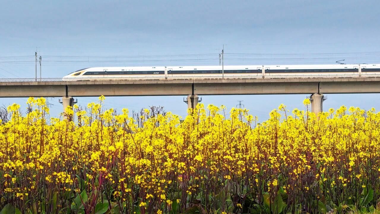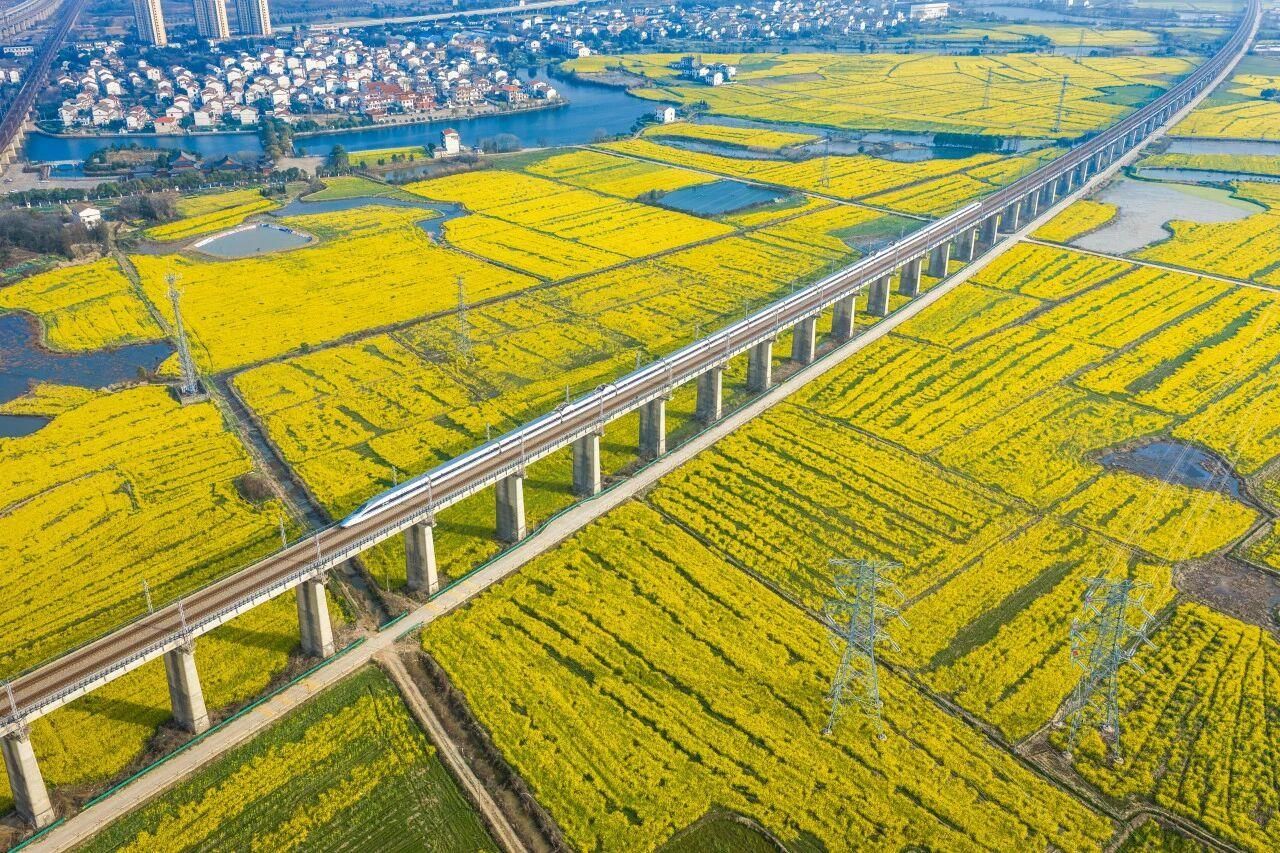 △高铁列车、油菜花田与水网村落交织成画。