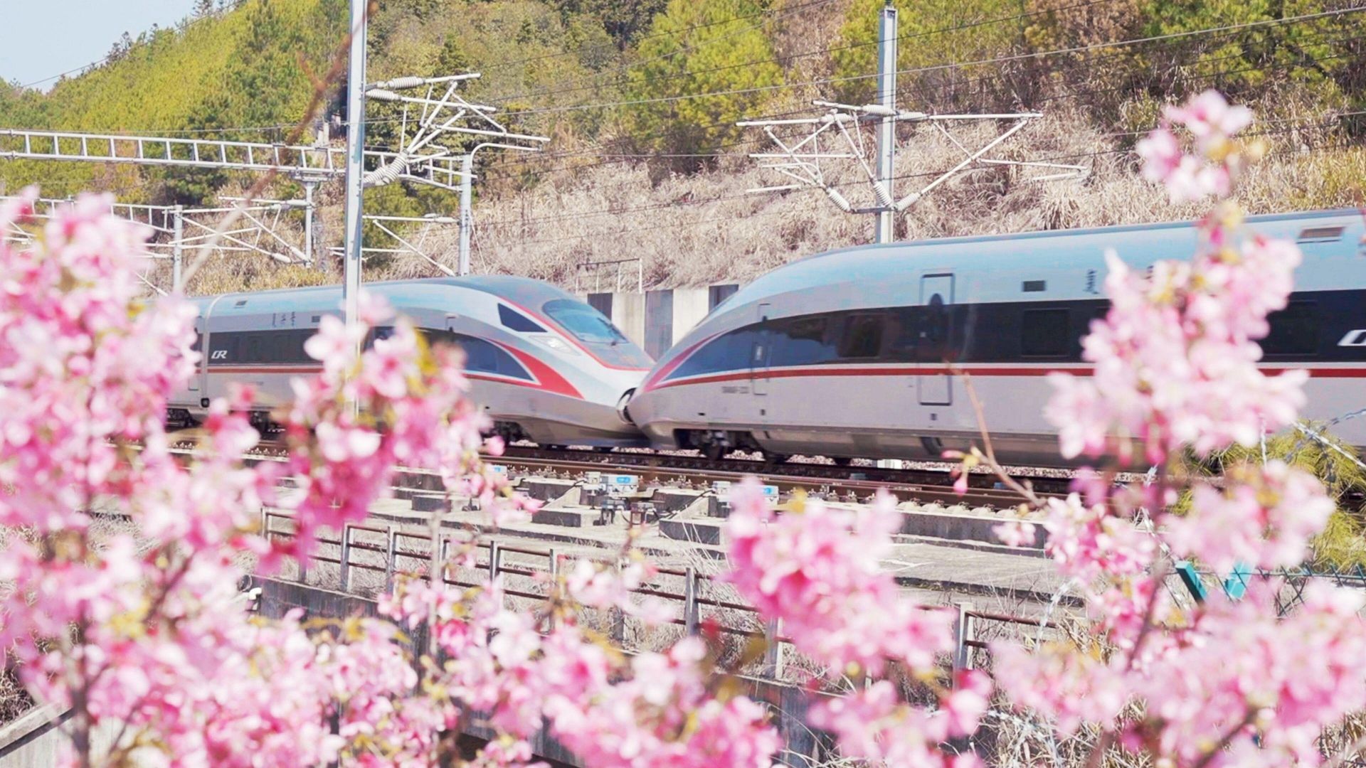 △合福高铁旁,盛开的樱花林与复兴号智能动车组同框。