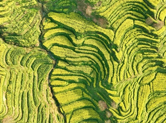 △列车驶出浮梁东站,线路旁五彩油菜花盛开,宛如油画。