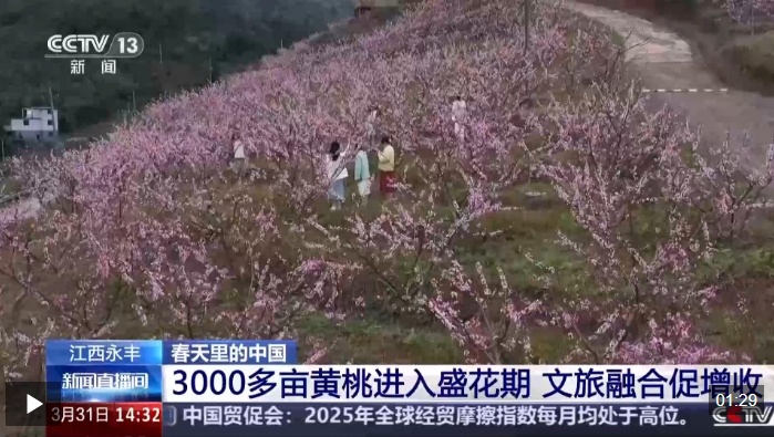 春风送暖,桃花漫山。这两天,江西吉安永丰县上溪乡的3000多亩黄桃进入盛花期,当地以此为契机,将生态观光、文化体验与线上助农直播有机结合,为乡村振兴注入新活力。