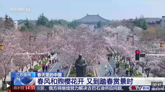 根据花期,今年扬州的樱花季从3月26日一直持续至4月3日,其间,当地还推出各种赏花活动,包括樱花打卡墙、樱花市集等,大家购买樱花文创产品,品尝樱花美食,留下春天的美好记忆。