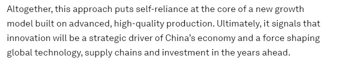 文章进一步分析认为,这种发展方式将自力更生置于以先进、高质量生产为基础的新型增长模式的核心。它表明创新将成为中国经济的战略驱动力,并在未来几年塑造全球技术、供应链和投资格局。