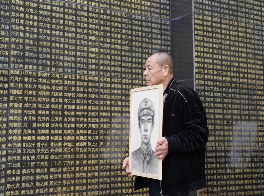 在瑞金革命烈士陵园,烈士家属手捧画像从烈士名单前走过(4月1日摄)。