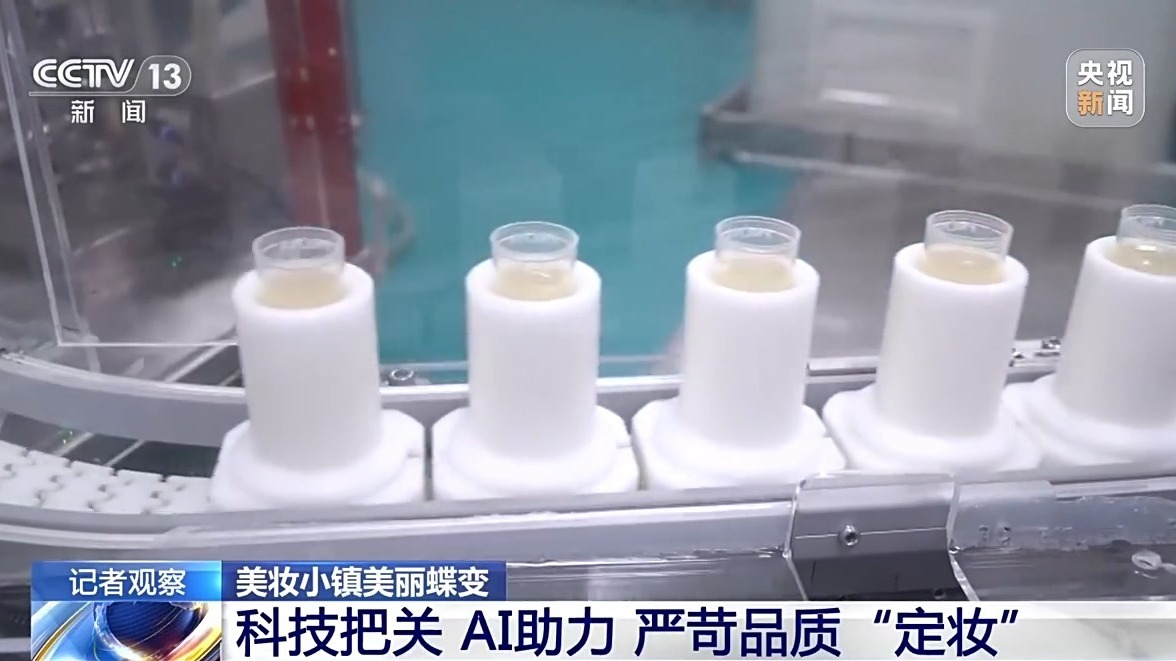 比生产速度更关键的是产品质量。车间内,刚灌装完成的护肤精华,正通过在线视觉检测设备进行严格检测。