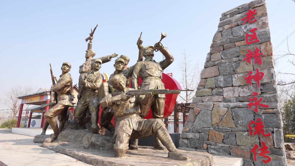 抗战时期,丁庄村人口不足200,却有40余人参军报国,被乡亲们称作“丁半连”。村口小广场的那座雕像,定格着丁庄村好儿郎当年浴血奋战的英勇模样:循着嘹亮军号,8位战士或蹲姿射击、或紧握机枪、或手托炸药包、或召唤战友——他们以一往无前的姿态,向着战场奋勇冲锋。