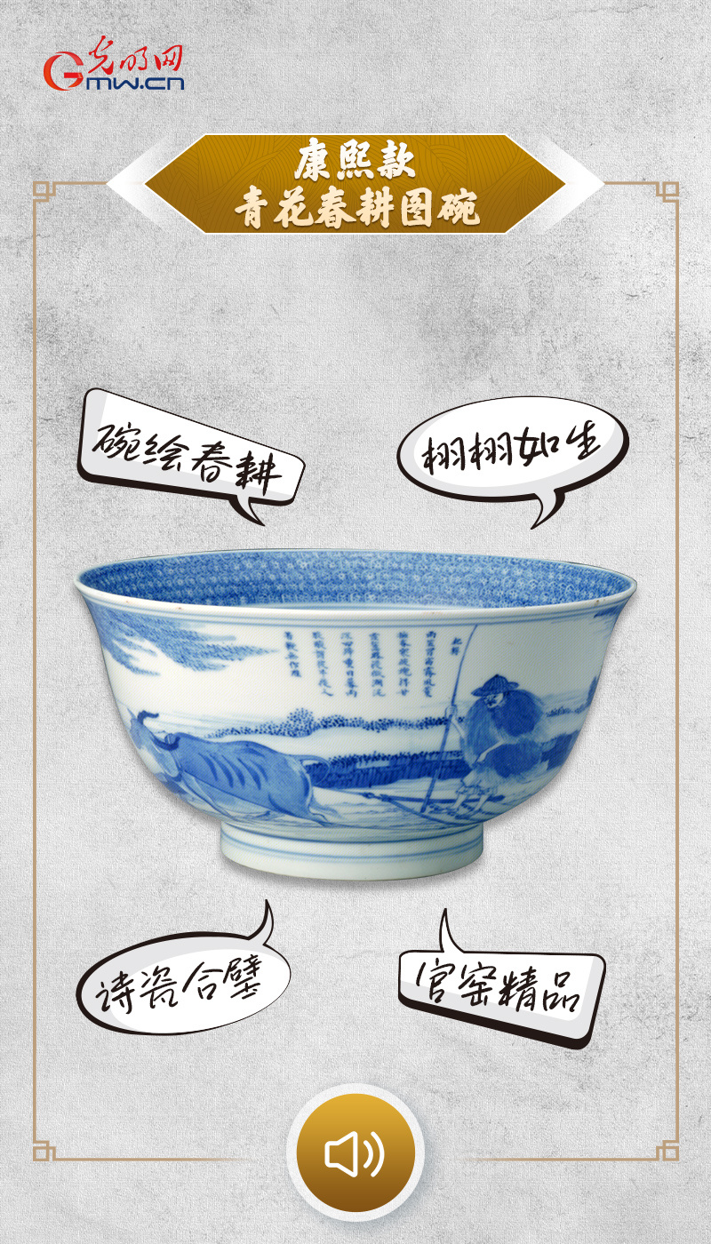 “碗内牧牛闲卧,外壁耙耨忙作,我以素白瓷胎为卷,以钴蓝青花为墨,绘就清朝的田间农忙。民以食为天,食从耕中来,这一方瓷碗里,盛着的不只是青花雅韵,更是对温饱的期盼。作为康熙官窑名品,我将春耕的烟火气与官窑的雅致感,于青花纹饰中静静流转,让农作的辛劳与收获的希望,随釉色温润,代代相传。”